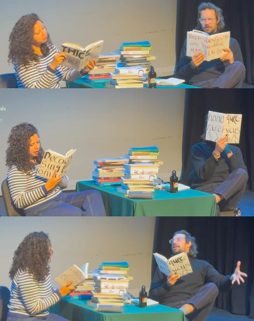 Devised in collaboration with colleague Priyanka Borpujari, Thicc Description is a farce on the performativity of PhD and postdoc competitiveness. In the play, two early-career scholars sit opposite each other, endlessly recommending ‘important’ academic books for the other to read. Each book has a fake name riffing on classic texts and concepts from the discipline of anthropology. ‘Thicc Description, Homo-queer-archicus, Decolonising Decoloniality, and A Thousand Chateaus’ are just a few examples. The play comes to a head as the two scholars pile up the books between then, obscuring their ability to see each other, and indicating their increasing alienation from human contact the deeper they fall into their ‘research’.